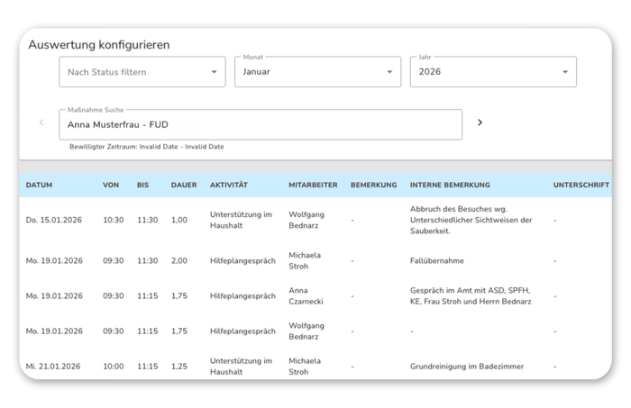 Verknüpfung von Maßnahmen, Zeiten und Kostenträgern für eine nachvollziehbare Abrechnung.